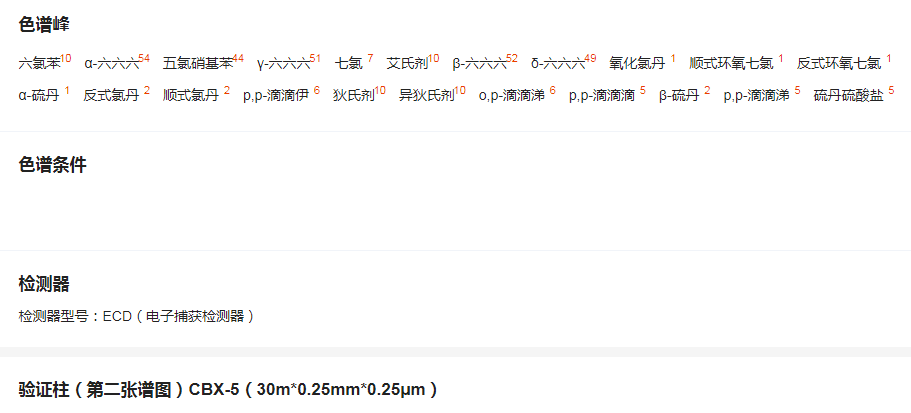 3.2.1 22种有机氯类农药对照品储备液(100-200ug/mL),经国家认证丙授予标准物质证书的标准物质。除β-六六六、异狄氏剂、o,p’-滴滴涕、p,p’-滴滴滴为200ug/ml外,其余均为100ug/mL。