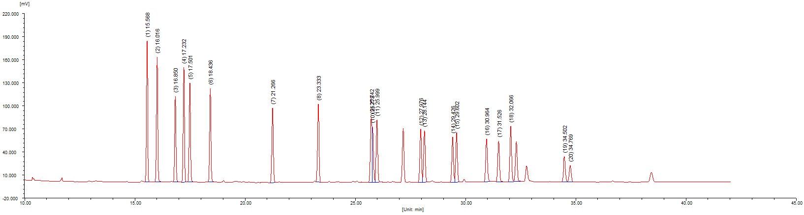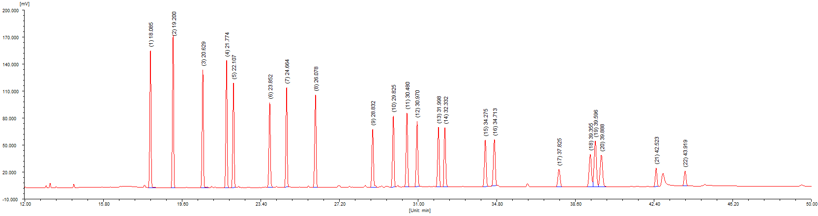 试样中有机氯农残经提取、净化后用气相色谱法测定,与标准品比较定量,电子捕获检测器对于负电极强的化合物具有极高的灵敏度,利用这一特点,可分别测出痕量的22种有机氯农药残留量。本实验按照第一法 毛细管气相色谱-电子捕获检测器法,采用CBX-17毛细色谱柱,以22种有机氯农残梯度标准溶液制作校正曲线,线性相关系数范围0.99583-0.99987,最低检出限为0.89-5.04ug/L,50ug/L标准溶液面积重复性(RSD%)为1.02-4.2%。