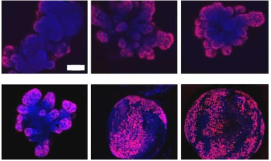 为了观察细胞的挤压是否会影响Wnt信号通路,以及细胞的生长速度,研究人员培育了类器官(微型器官),在这种情况下,研究者就能从小鼠的肠道组织中收集特殊的细胞簇;Wnt信号通路对于结肠非常重要,位于人类肠道组织中的细胞能够持续不断更新补充,而Wnt信号对于维持肠道干细胞、产生新细胞并不断“刷新”肠道内壁至关重要。随后研究人员在培养皿中培育出了尺寸仅有半毫米大小的肠道类器官,随后向培养皿中注入聚合物来挤压类器官,这种聚合物的涌入会增加每个类器官周围的渗透压,并迫使水分从细胞中流出,研究者发现,参与激活Wnt信号通路的特殊蛋白会被挤在一起,并且更有可能聚集在一起来开启该通络的表达及其调节生长的基因的表达。