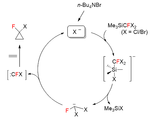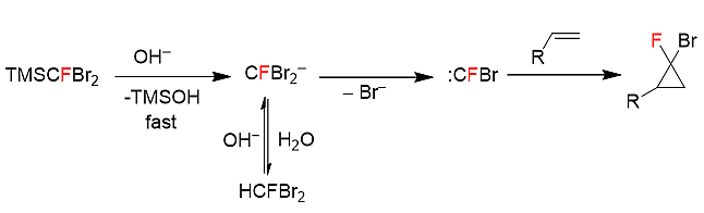 在非水介质中,n-Bu4NBr中的溴离子(作为路易斯碱引发剂)在加热下进攻TMSCFX2的硅原子,生成五配位硅中间体,释放出一氟一卤甲基负离子。一氟一卤甲基负离子经α-消除反应,得到氟卤卡宾,随后与烯烃反应得到氟卤环丙烷。由于三种不同的卡宾试剂的路易斯酸度不同,所以它们的反应性(与路易斯碱n-Bu4NBr的反应)不同。但是,在水性反应介质中,NaOH(作为强亲核试剂)不但可以轻易与所有三种氟卤卡宾试剂(TMSCF2Br、TMSCFCl2和TMSCFBr2)反应释放出氟卤卡宾,而且可以进一步与氟卤卡宾发生反应。因为氟氯卡宾和氟溴卡宾与氢氧根离子的反应活性远远低于二氟卡宾, 因此在水性反应介质中, TMSCFCl2和TMSCFBr2可以对烯烃进行高效的[2+1]环丙烷化反应,但是TMSCF2Br却无法做到。